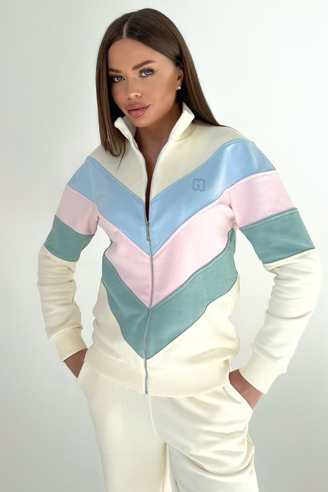 Стильный женский свитшот спортивного стиля покроя оверсайз. Пошит из комфортной всесезонной ткани (петельного футера 3-нитки высшего качества пенье). Свитшот свободного кроя со спущенной линией плеча и длинным рукавом. По центру переда короткая застежка-молния, переходящая в стойку. Низ свитшота дополнен кулисой и шнуром внутри для фиксации ширины изделия на уровне талии. Стойка, манжеты рукавов выполнены из ткани-компаньена кашкорсе. Слева на переде свитшота вышит логотип в цвет ткани.
