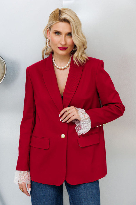 Жакет полуприлегающего кроя. с кружевными элементами. По переду расположены карманы с клапаном. Рукава со сьемными декоративными кружевами. по спинке шлица. Жакет на подкладке. в комплекте идет пояс с кружевной вставкой.