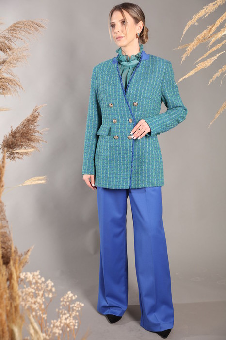 Яркий удлинённый жакет поможет украсить любой повседневный или же праздничный образ!Классический двубортный жакет без лацканов и воротника из мягкого твида, среднего объема, полуприталенного силуэта. Застёжка на 2 пуговицы. По уровню талии - имитация карманов с клапанами. Фурнитура и материалы отделки могут незначительно отличаться от тех, что на фотографии.