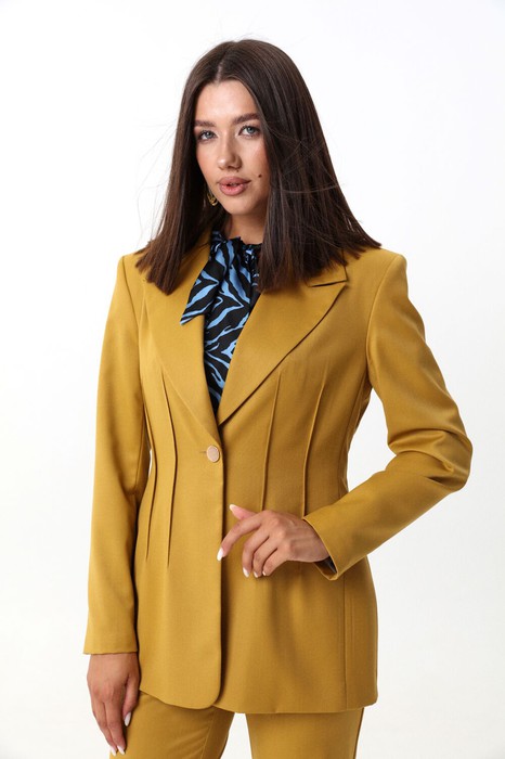 Жакет однобортный умеренного объема, приталенного силуэта. Силуэт изделия создается за счет отрезных бочков на спинке и полочке, а также за счет среднего шва и плечевых вытачек на спинке. На полочке нагрудная вытачка переведена в плечевой шов. Плечевой пояс расширен и поддерживается плечевыми накладками. Рукав втачной, длинный, двухшовный. Воротник отложной с отрезной стойкой, пиджачного типа. Застежка на уровне линии талии на одну петлю и пуговицу. Жакет полностью обработан притачной подкладкой. Длина изделия до середины бедер. Фурнитура и материалы отделки могут незначительно отличаться от тех, что на фотографи.