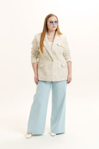 Жакет на подкладке с объёмными рукавами. Перед выполнен на запах с застежкой на кнопки, под пояс по талии.
