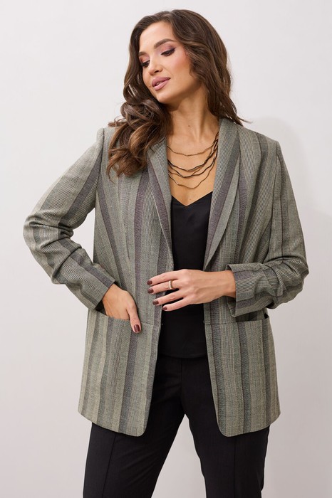 Жакет женский полуприлегающего силуэта на центральной застёжке, в области талии на потайной крючок. Перед с горизонтальными подрезами ниже линии талии, в котором выполнен карман и талиевыми вытачками от подреза. Спинка со средним швом и рельефами от проймы до низа. Горловина v-образной формы с шалевым воротником. Рукав втачной двухшовный длиной 7/8 с фиксированной драпировкой по низу. Жакет на полной подкладке.