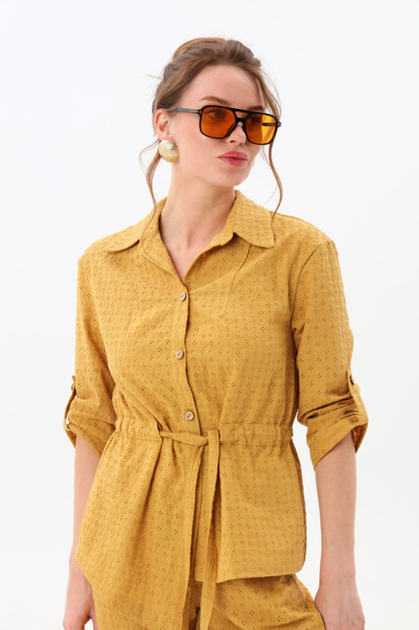 Жакет прямого силуэта, воротник пиджачного типа, рукав одношовный, втачной с незначительно спущенной линией плеча, длиной три четверти, с патой. По линии ткани настрачная кулиса с завязками из основной ткани. Застежка центрально-бортовая. Линия низа верхней части фигурная ассиметричная.