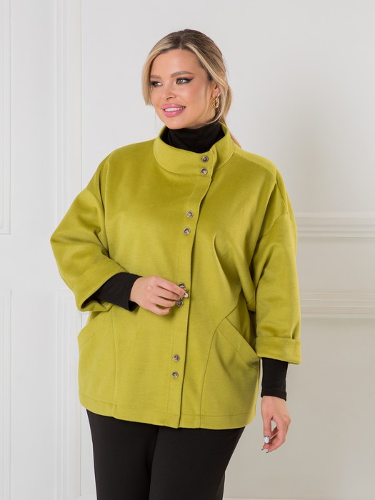 Удобный повседневный жакет свободного силуэта, выполнен из облегченного драпа. Жакет по переду с ассиметричной застежкой на петли и пуговицы, отрезными фигурными бочками и двумя удобными накладными карманами, повторяющими форму бочков. Спинка целая. Горловина переда и спинки с высоким втачным воротником-стойкой. Жакет с удлиненной линией плеча и свободной заниженной проймой. Рукав втачной длиной 3/4 с притачным отложным манжетом по низу. Длина рукава от горловины в 50 р-ре – 55 см. в 58 р-ре – 58 см., ширина рукава по низу в 50 р-ре – 33 см. в 58 р-ре – 39 см. Жакет без подклада. Длина изделия по спинке в 50 р-ре – 67 см. в 58 р-ре – 72 см.