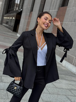 Жакет полуприлегающего силуэта, на подкладке, втачного покроя, по свободе облегания – «оверсайз». Воротник пиджачного типа. Застежка жакета центрально-бортовая, на пуговицы. Рукав двухшовный, полной длины. На переде расположены вертикально направленные карманы с нагрудной вытачкой, а в области бедер – прорезные в рамку с клапаном, в верхней левой части переда расположена имитация кармана в рамку. Клапаны и борта по низу слегка закруглены. Спинка состоит из бочка и центральных частей. К жакету может прилагаться пояс-шнур из декоративных материалов.