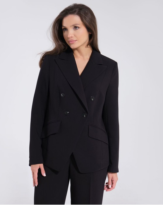 Жакет женский из синтетической ткани для повседневной носки. Жакет на вискозной подкладке. Прилегание силуэта достигается за счет рельефов. Жакет двубортный, застегивающийся на пуговицы.Рукав длинный.
