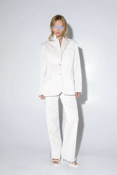 Оверсайз жакет из фактурной экокожи с анималистичным рисунком. Детали: жакет прямого силуэта, расширенная линия плеч, пиджачный воротник, перед с прорезными функциональными карманами, однобортная застежка на петли и пуговицы, спинка со средним швом и шлицей, рукава втачные двухшовные, жакет на подкладке.