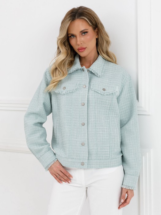 Модель прямого силуэта, с кокетками и рельефами, на подкладе. Спереди центральная застёжка на кнопки и наклонные прорезные карманы с листочкой.Под кокетками декоративные клапаны с кнопками. Воротник на стойке. По низу рукава шлица, защипы и манжета с застёжкой на кнопку. Низ жакета обработан частично собранным на резину поясом.