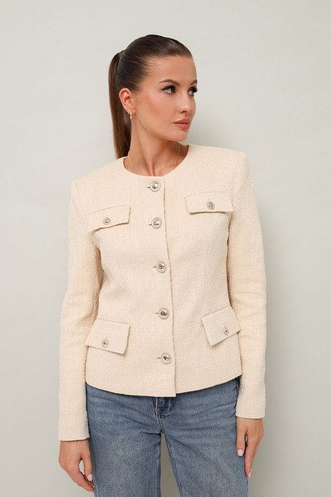 Жакет полуприлегающего  силуэта, выполнен из структурной ткани. Округлый вырез горловины. Застежка центральная на петли и пуговицы. Спереди обработаны декоративные клапаны с пуговицами. Рукава втачные двухшовные. Спинка со средним швом и рельефами. Жакет на подкладке.