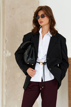 Стильный жакет полуприлегающего силуэта, выполнен из полушерсти. Воротник пиджачного типа с отложными лацканами. Застежка центральная на петли и пуговицы. Спереди обработаны накладные карманы, в области груди подрезы с нагрудными вытачками. Спинка с рельефами и средним швом, переходящим в шлицу. Рукава втачные двухшовные, на левом рукаве декоративная нашивка. Изделие на подкладке.