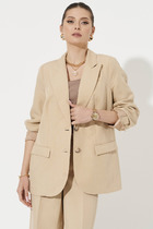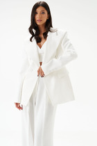 Стильный жакет полуприлегающего силуэта, выполнен из полушерсти. Застежка центральная на декоративные крючки и потайные кнопки. Воротник пиджачного типа с отложными лацканами. Спереди обработаны накладные карманы, в области груди подрезы с нагрудными вытачками. Спинка с рельефами и средним швом переходящим в шлицу. Рукава втачные двухшовные. Изделие на подкладке.