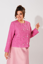 Силуэтный жакет с подчеркнутой линией талии. Смещенная застежка на петлю и пуговицу. Воротник пиджачного типа с отложными лацканами, край борта скругленный по низу жакета. Спереди обработаны прорезные карманы в рамку с клапанами и нагрудный прорезной карман с листочкой. Рукава втачные, двухшовные с отлетнымм шлицами. Спинка с рельефами и средним швом, переходящим в шлицу. Изделие на подкладке.