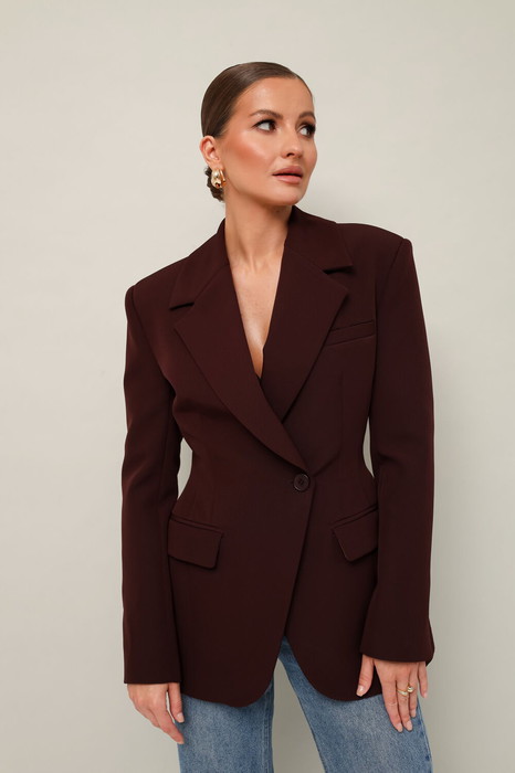 Силуэтный жакет с подчеркнутой линией талии.  Смещенная застежка на петлю и пуговицу. Воротник пиджачного типа с отложными лацканами, край борта скругленный по низу жакета. Спереди обработаны прорезные карманы в рамку с клапанами и нагрудный прорезной карман с листочкой. Рукава втачные, двухшовные с отлетнымм шлицами. Спинка с рельефами и средним швом, переходящим в шлицу. Изделие на подкладке.