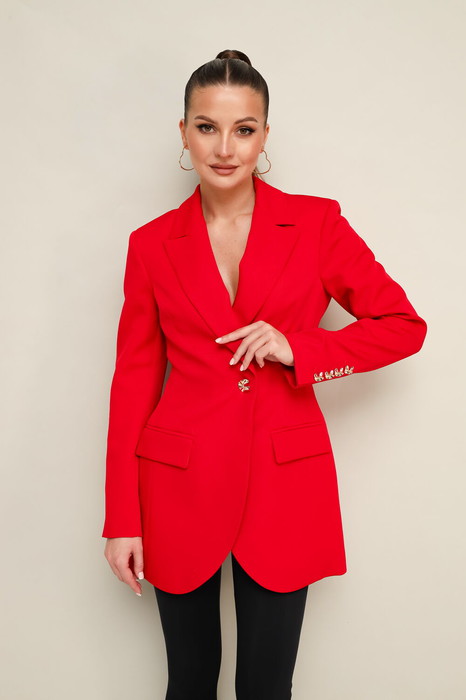 Стильный жакет полуприлегающего силуэта, выполнен из костюмной ткани. Смещенная застежка на петлю и пуговицу. Воротник пиджачного типа с отложными лацканами, край борта скругленный по низу жакета. Спереди обработаны прорезные карманы в рамку с клапанами. Рукава втачные, двухшовные со шлицами с застежкой на петли и пуговицы. Спинка с рельефами и средним швом. Жакет на подкладке.