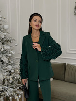 Жакет актуального прямого кроя, выполнен из костюмной ткани. Воротник пиджачного типа с отложными лацканами, край борта скругленный по низу жакета. Спереди обработаны прорезные карманы в рамку с клапанами. Рукава втачные двухшовные. Спинка со средним швом. Низ жакета и рукавов декорирован французским кружевом. Жакет обработан подкладкой.
