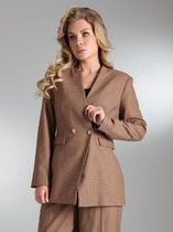 Жакет полуприлегающего силуэта, длиной ниже линии бедер. Спинка со средним швом, в котором обработана шлица, с рельефами от пройм до низа. Перед с нагрудной вытачкой, рельефом и прорезным карманом «в рамку». Рукава двушовные, втачные, длинные. Воротник пиджачного типа с лацканом. Застежка на петлю и пуговицу. Жакет по левому лацкану и рукавам дополнен съемным декором с цепочками. Жакет на подкладке.