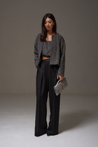 Жакет полуприлегающего силуэта, длиной ниже линии бедер. Спинка со средним швом, в котором обработана шлица, с рельефами от пройм до низа. Перед с нагрудной вытачкой, рельефом и прорезным карманом «в рамку». Рукава двушовные, втачные, длинные. Воротник пиджачного типа с лацканом. Застежка на петлю и пуговицу. Жакет на подкладке.