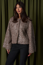 Жакет женский прямого силуэта, длиной ниже линии бедер, с втачным рукавом. Застежка центральная на три петли и пуговицы, воротник отложной с лацканами. По переду рельефные швы. Верхняя часть переда с декоративным клапаном, нижняя часть переда с прорезными карманами с клапаном. Спинка со средним швом. Рукав длинный двухшовный, по низу декоративная шлица. По краю борта, лацканов воротника, клапанов отделка - бахрома. Жакет на подкладке.
