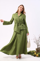 Жакет прямого силуэта с застёжкой на молнию. Перед с нагрудными вытачками, декоративными клапанами, накладными карманами. Спинка цельная. Рукав втачной, длинный, снизу присобран на манжету из довяза. Горловина обработана воротником-стойкой из довяза в стиле бомбера, что придаёт образу современный спортивный акцент. Небольшие боковые разрезы добавляют комфорта и делают силуэт более лёгким.
