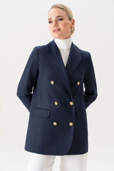 Пиджак женский удлиненный приталенный синий URS  – это воплощение элегантности, стиля и практичности в одном изделии. Современные модные тенденции снова обращаются к классике, и именно поэтому женский жакет, особенно удлинённого кроя, стал настоящим must-have в гардеробе каждой женщины. Модель подчеркивает фигуру, выглядит дорого и изысканно, подходит для разных случаев – от деловых встреч до вечерних выходов. Жакет женский, свободного полуприлегающего силуэта, выполнен из костюмной ткани, на притачной подкладке, с двубортной застежкой на 2 петли и 6 декоративных пуговиц (размер и цвет фурнитуры может незначительно отличаться от фото),  для повседневной носки.