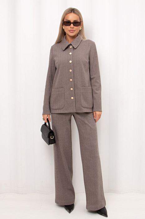 Комфортный жакет прямого силуэта из утепленного костюмного трикотажа в ёлочку. Длинный втачной рукав. Отложной воротник. По переду накладные карманы. По центру переда застежка на петли и пуговицы. Модель без подкладки.