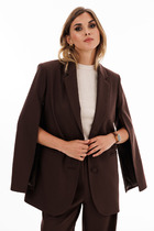 Жакет прямой. Застежка на петли и пуговицы. Воротник пиджачный. На переде накладные карманы. На верхнем кармане выполнена вышивка. По спинке шлица. Рукав прямой со шлицей понизу. Жакет на хлопковой подкладке.