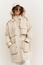 Модель с капюшоном (не отстегивается), два глубоких кармана на груди скрыты небольшими планками, линия талии выполнена резинкой, подол-баска определенно придает изделию шарма, дополняют весь образ изделия - манжеты «воланы»