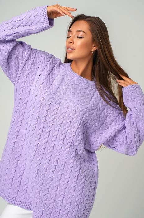 Вязаный джемпер лавандового цвета дарит комфорт и свободу движений благодаря трендовому крою oversize и длинному широкому рукаву. Узор коса добавляет нотку кокетства.
