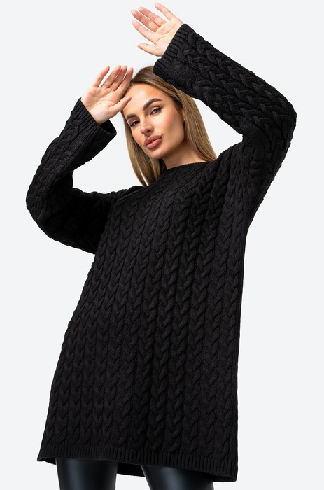 Джемпер дарит комфорт и свободу движений благодаря трендовому крою oversize и длинному широкому рукаву. Узор коса добавляет образу нотку кокетства. Черный джемпер отлично подходит для беременных женщин.