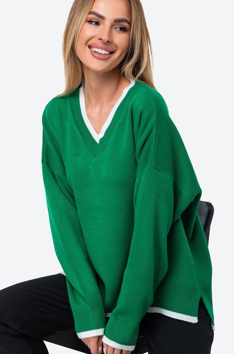 Свитер оверсайз с V-образным вырезом – необходимая база для создания стильного образа. Джемпер с удлиненной спинкой представлен в ярком зеленом цвете, горловина, рукава и подол окантованы белой каймой.