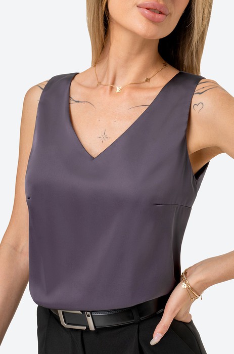 Однотонный топик графитового цвета — идеальный вариант на лето. Офисная модель для женщин идеально садится на любую фигуру благодаря прямому крою и делает силуэт более стройным. Соблазнительный V-образный вырез акцентирует зону шеи и ключиц.