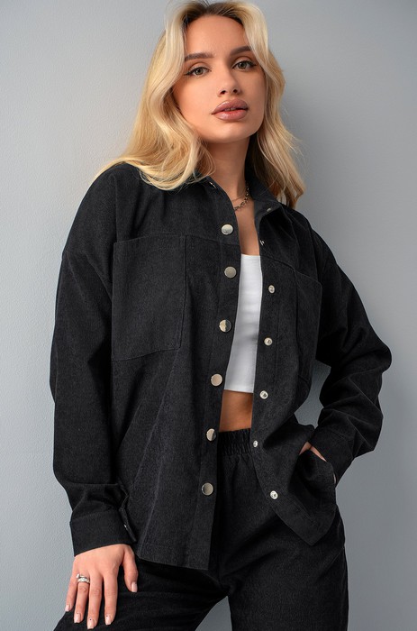 Женский брючный черный костюм объединяет в себе утонченность и практичность. В комплекте рубашка оверсайз (oversize) с акцентными большими карманами и металлическими кнопками, а также брюки джоггеры. Однотонный вельветовый костюм двойка для женщин идеален для весны, осени и прохладной погоды летом.