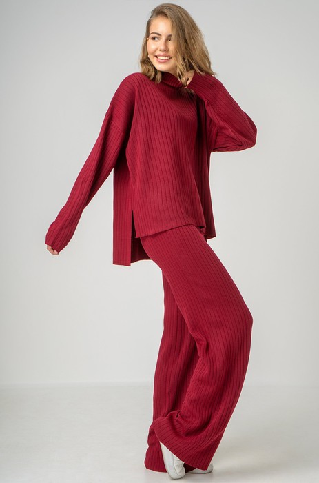 Женский бордовый костюм из вязаного трикотажа лапша — идеальный выбор для уверенных в себе леди.
