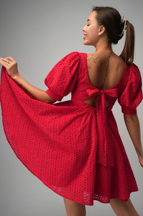 Горячий акцент лета — короткое женское платье в насыщенном красном цвете. Привлекает взгляд, подчеркивает фигуру и играет в движении благодаря юбке-клёш и легкой хлопковой ткани с узором шитьё.