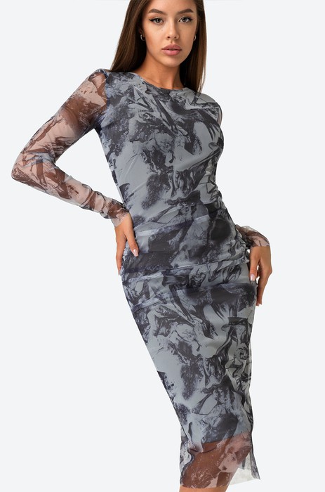 Женское платье выполнено из прочной сетки с добавлением вискозы с эластаном. Мраморный принт и прозрачные рукава с прорезями для большого пальца придают особую привлекательность и шарм.