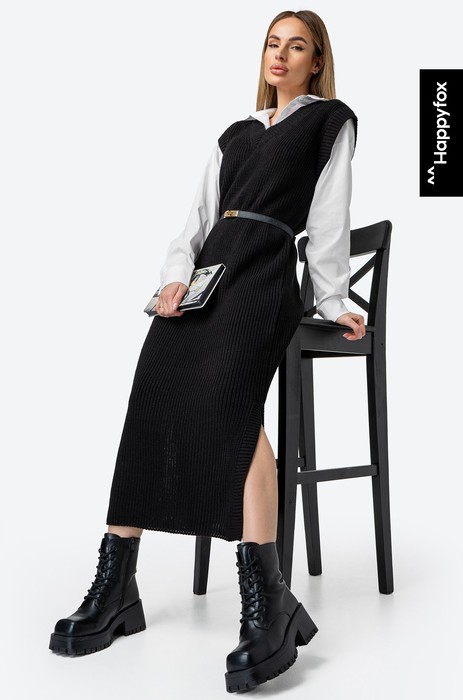 Невероятно мягкое женское платье-жилет из акрила и шерсти поможет забрать с собой частичку домашнего тепла на работу или на романтическое свидание. Удлиненный силуэт, элегантный V-образный вырез, изящные разрезы по бокам – в этом черном платье для женщин есть все, что поможет оставаться стильной в любой ситуации!