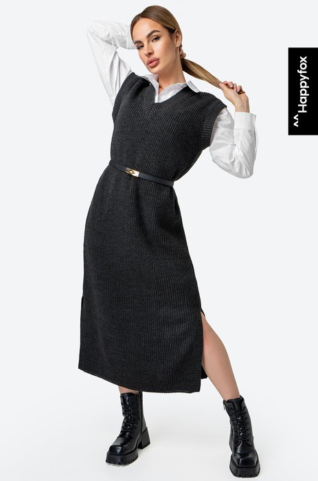 Платье-жилетка миди дарит комфорт благодаря свободному крою. Нежная фактурная вязка делает образ уютным, а V-вырез и разрезы добавляют нотку кокетства.