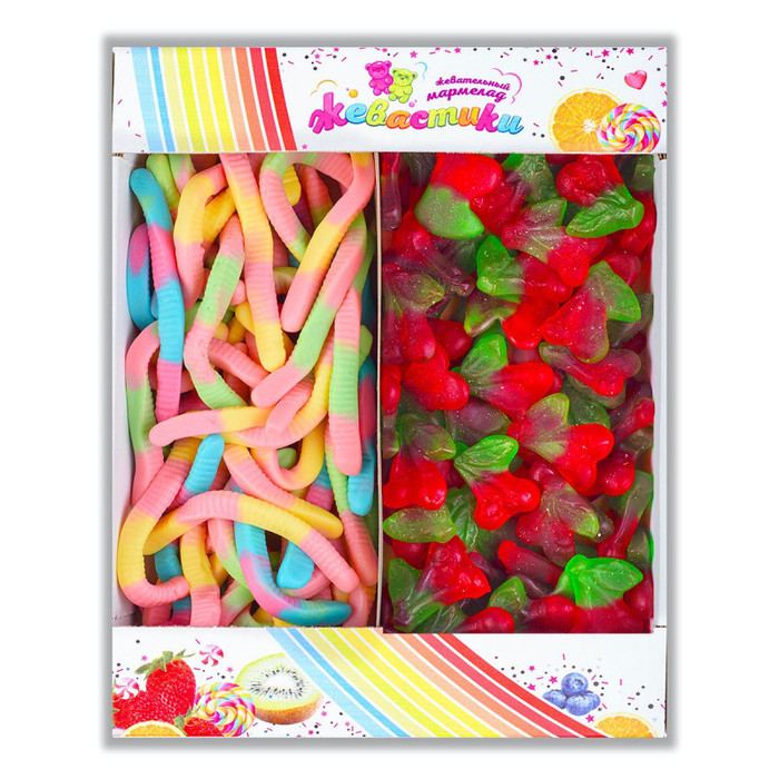 Мармелад Жевастики - фруктовый сочный жевательный мармелад с натуральным соком, выполненный в форме цветных фигурок. Уникальная возможность попробовать два вида мармелада в одном наборе: 1) Мармелад Неоновые червячки 350 гр станут любимым лакомством всех детей и взрослых, они очень вкусные, в меру сладкие, с насыщенным фруктовым вкусом и приятной кислинкой. 2) Мармелад Вишня 350 гр - ароматные и вкусные мармеладки в форме вишенок поднимут настроение каждому, это отличный выбор для угощения детей и взрослых. Кроме того, мармелад можно использовать как декор для домашних пирожных и тортов. Яркий и красивый дизайн коробки позволяет использовать мармелад в качестве подарка для родных и близких.