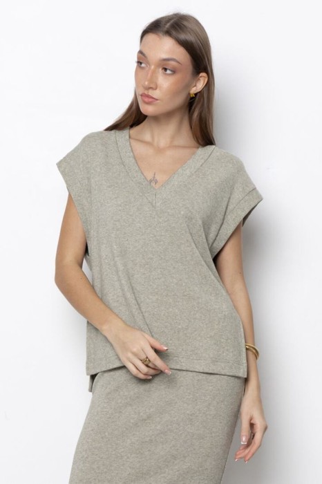 Жилет свободного силуэта с V-образным вырезом и расслабленными приспущенными рукавами.