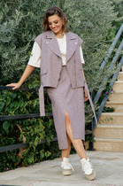 Жилет с открытыми плечами прилегающего силуэта выполнен из костюмной ткани шоколадного цвета. Характеристики: прилегающий силуэт, подкладка, застежка центральная на петли пуговички, отложной воротник, по переду изделия карманы. Длина по спинке 59 см.