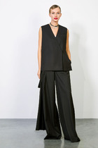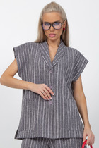 Жилет удлиненный прямого силуэта с центральной двубортной застежкой на петли и пуговицы. По переду обработаны нагрудные вытачки, карманы с наклонным входом с листочкой. Спинка со средним швом, в котором обработана шлица. По спинке и переду выполнены отлетные кокетки с отделочными строчками контрастного цвета. В области талии расположены широкие шлевки для пояса из основной ткани, которым комплектуется жилет. По горловине воротник с отрезной стойкой. В области плечевых швов расположены декоративные паты с пуговицами. Все отделочные строчки выполнены гарусной нитью контрастного цвета.