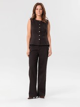 Жилет двубортный с отложным воротником на отрезной стойке, умеренного объема, прямого силуэта с застежкой на петли и пуговицы. Талия фиксируется съемным ремнем из экокожи, для которого в боковых швах оформлены шлевки. Ремень идёт в комплекте к изделию.