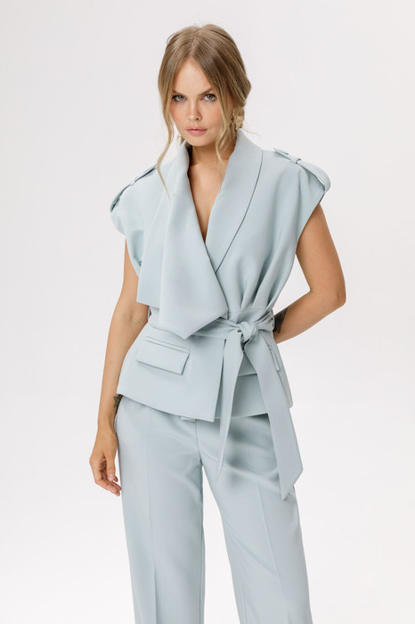 Детали: жилет приталенного силуэта, асимметричный воротник-шаль, отрезная линия талии со складками, спущенное плечо, функциональные карманы, застежка на петли и пуговицы, съемный пояс, жилет на подкладке.