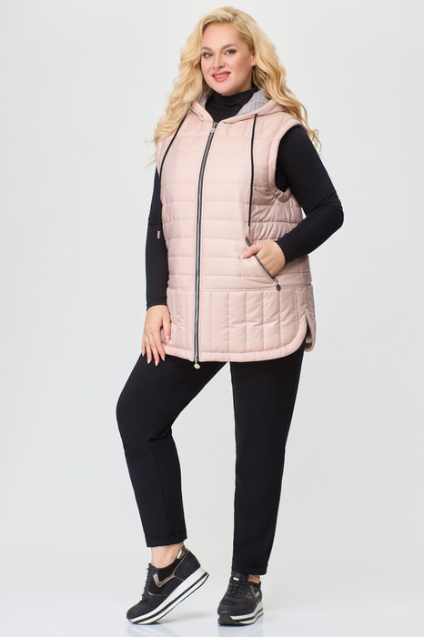 Жилет женский стеганый, прямого силуэта с  капюшоном, застежкой на молнию, кокетками и подрезами по переду и спинке, прорезными карманами на молнии, на подкладке. Утеплитель синтепон.