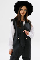 Жилет женский из ткани «под замшу» прямого силуэта на подкладке, вырез горловины глубокий V-образный,  по боковым швам разрезы, по переду и спинке горизонтальные декоративные швы. Длина 69 см.