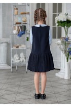 Модель сарафана из однотонной костюмной ткани силуэта трапеции. Нижняя часть сарафана из ткани плиссе. Вырез округлой формы с застёжкой на молнию по среднему шву спинки. Перед сарафана с рельефными швами из горловины. Верхняя часть переда с декоративными пуговицами. Горловина и проймы обработаны внутренними обтачками со стороны изнанки.