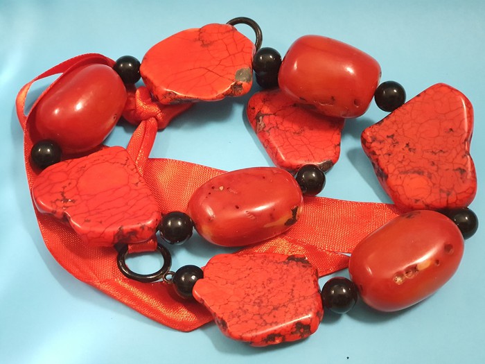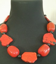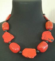 крупные бусины красного цвета неправильной формы чередуются с небольшиими черными бусинами
