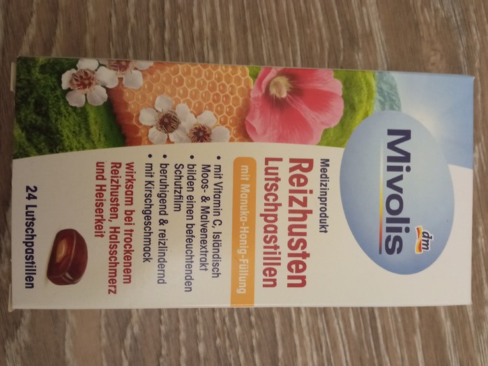 Леденцы от сухого кашля Mivoli с начинкой из меда манука обеспечивают эффективное увлажнение полости рта, горла и глотки благодаря особой комбинации активных ингредиентов экстрактов мальвы и исландского мха. Отдельные активные ингредиенты образуют защитную пленку на раздраженных, сухих слизистых оболочках и мягко успокаивают типичные симптомы простуды, такие как сухой кашель, боль в горле и осиплость голоса. В результате боль уменьшается.
