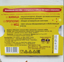 Состав: сахар, патока крахмальная, кедровое масло, кедровая живица, прополис, мёд, лимонная кислота, масло лимона.