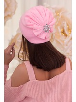 «Розария» - это невероятно нежный головной убор, связанный из полушерстяной пряжи мелкой узорной вязкой. Внутренняя мягкая резинка обеспечивает комфортную посадку и не оставляет следов на коже. Зажим на заднем полотне изделия образует цветок. Эксклюзивная брошь с камнями алмазной огранки лаконично дополняет модель и разместилась в центре цветка. Металлический брендовый логотип служит дополняющим элементом. Шапка изготавливается из мягкого материала, что позволяет изменять форму в связи с анатомическими особенностями головы или в зависимости от настроения и стиля. Аксессуар носят, немного приспустив, либо, напротив, плотно сдвинув на брови. В первом варианте задняя часть откидывается назад или сдвигается на бок, что выглядит весьма кокетливо. Такой способ наделит образ игривостью и женственностью.